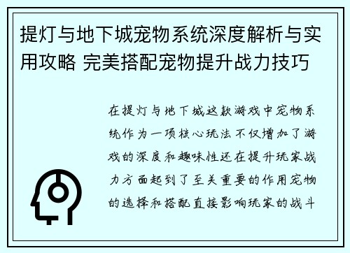 提灯与地下城宠物系统深度解析与实用攻略 完美搭配宠物提升战力技巧